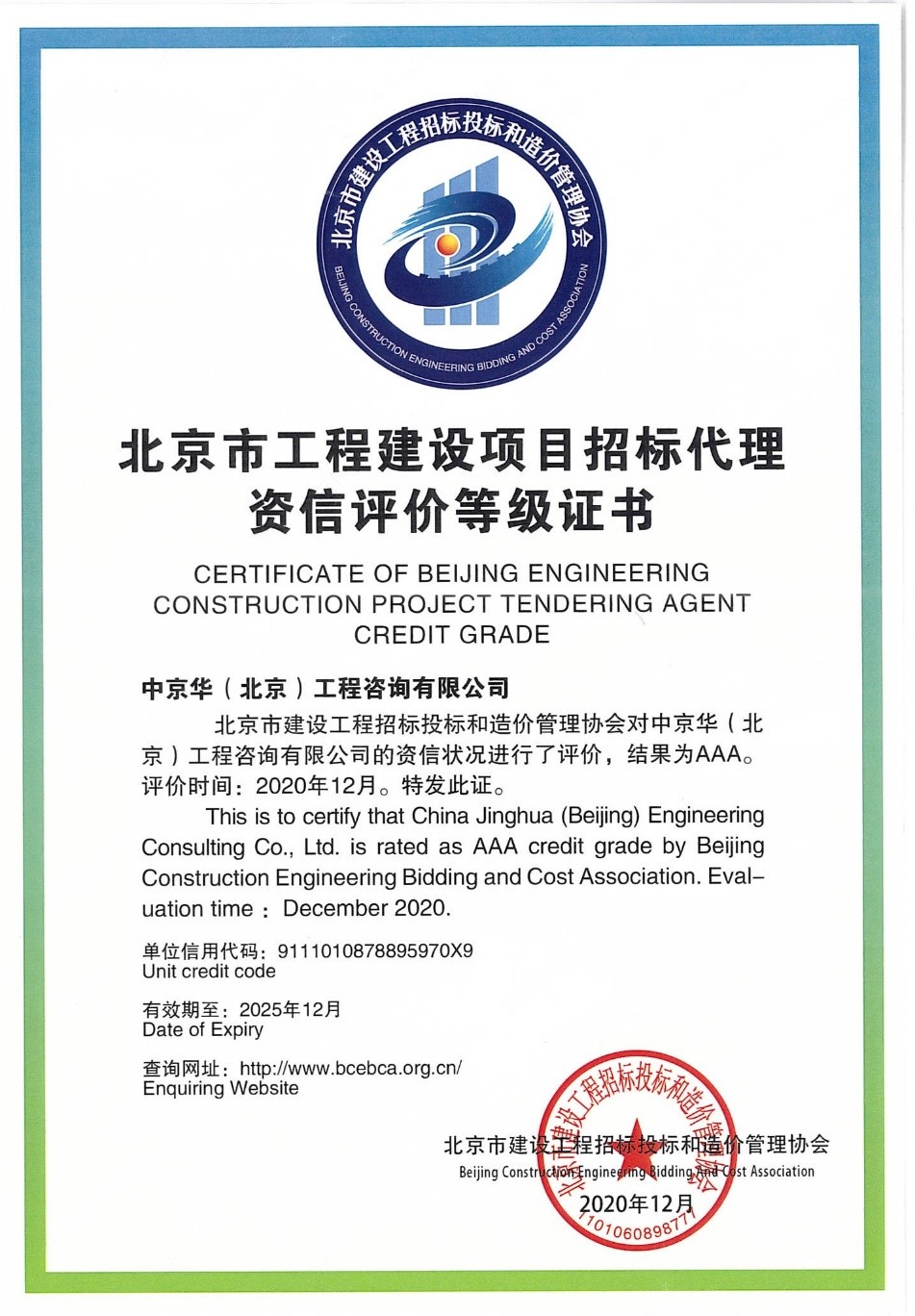 中京华荣获北京市招标代理企业3A资信评价等级证书